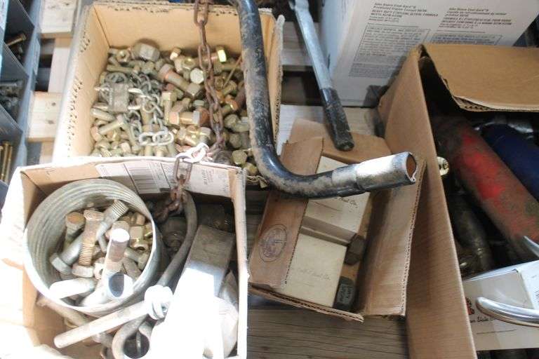 Pallet Full of Ranch Supplies & Hardware Bolts, Pins, Rubber Snubbers, Load Straps, Trailer Lights, Misc. Hardware