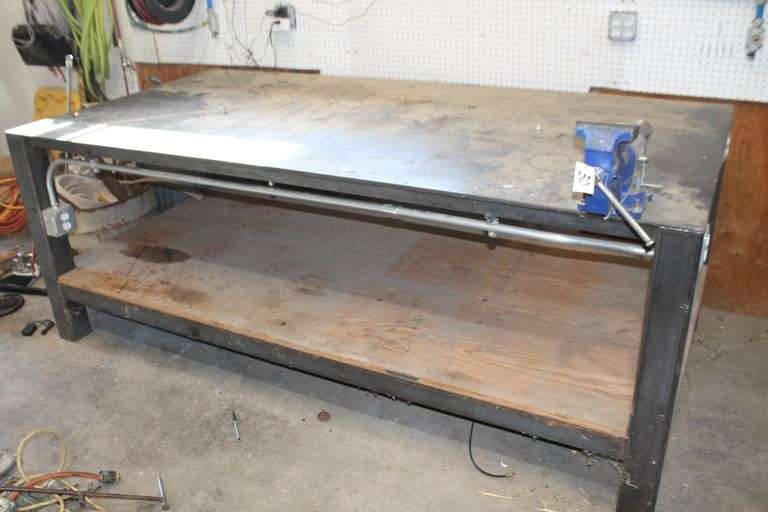 LOT 130 - "Custom Built HD Work Bench, Power Outlets w/ Vice 1/2 inch Steel Top 8ft. long 4ft. Wide 36 inch